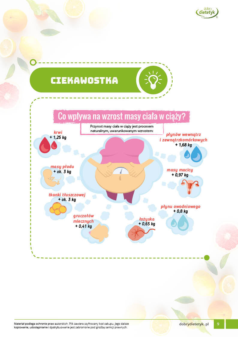 Program żywieniowy został skomponowany tak, aby zapewnić mamie i dziecku odpowiednią podaż energii oraz składników odżywczych niezbędnych przez cały PIERWSZY TRYMESTR CIĄŻY. Wszystkie posiłki są zbilansowane w taki sposób, aby zapewnić optymalny przyrost masy ciała oraz zapobiec wystąpieniu anemii, cukrzycy ciążowej i nadciśnieniu tętniczemu. W diecie zwrócono szczególną uwagę na składniki mineralne, takie jak kwas foliowy, żelazo, wapń, magnez. Posiłki skomponowano w oparciu o niski ładunek glikemiczny.