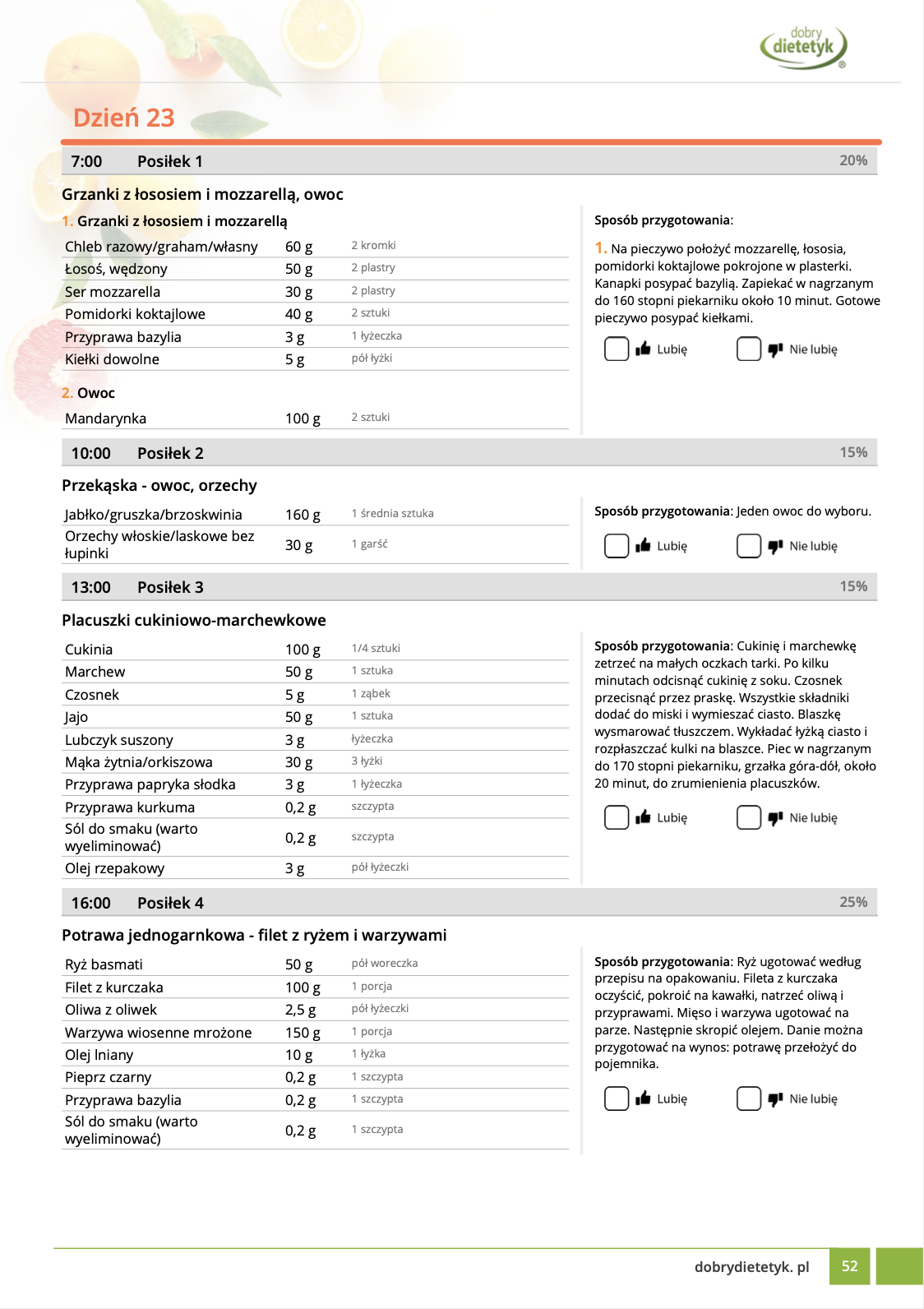 w formie propozycji posiłków (zamiast pojedynczych jadłospisów jednodniowych, przygotowano propozycje kilku propozycji dań na każdy posiłek). Tutaj nie uzależniamy Cię od tego jakie masz np. w danym dniu zjeść śniadanie czy obiad, tylko sam wybierasz sobie ulubione danie z kilku przedstawionych przez nas propozycji.