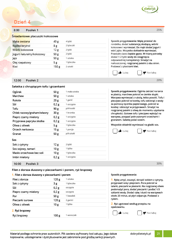 • w formie precyzyjnych jadłospisów wielodniowych (na każdy dzień miesiąca jest opracowany osobny jadłospis). Tutaj nie musisz zastanawiać się co zjeść każdego dnia, gdyż będziesz mieć dokładnie wszystko rozplanowane.